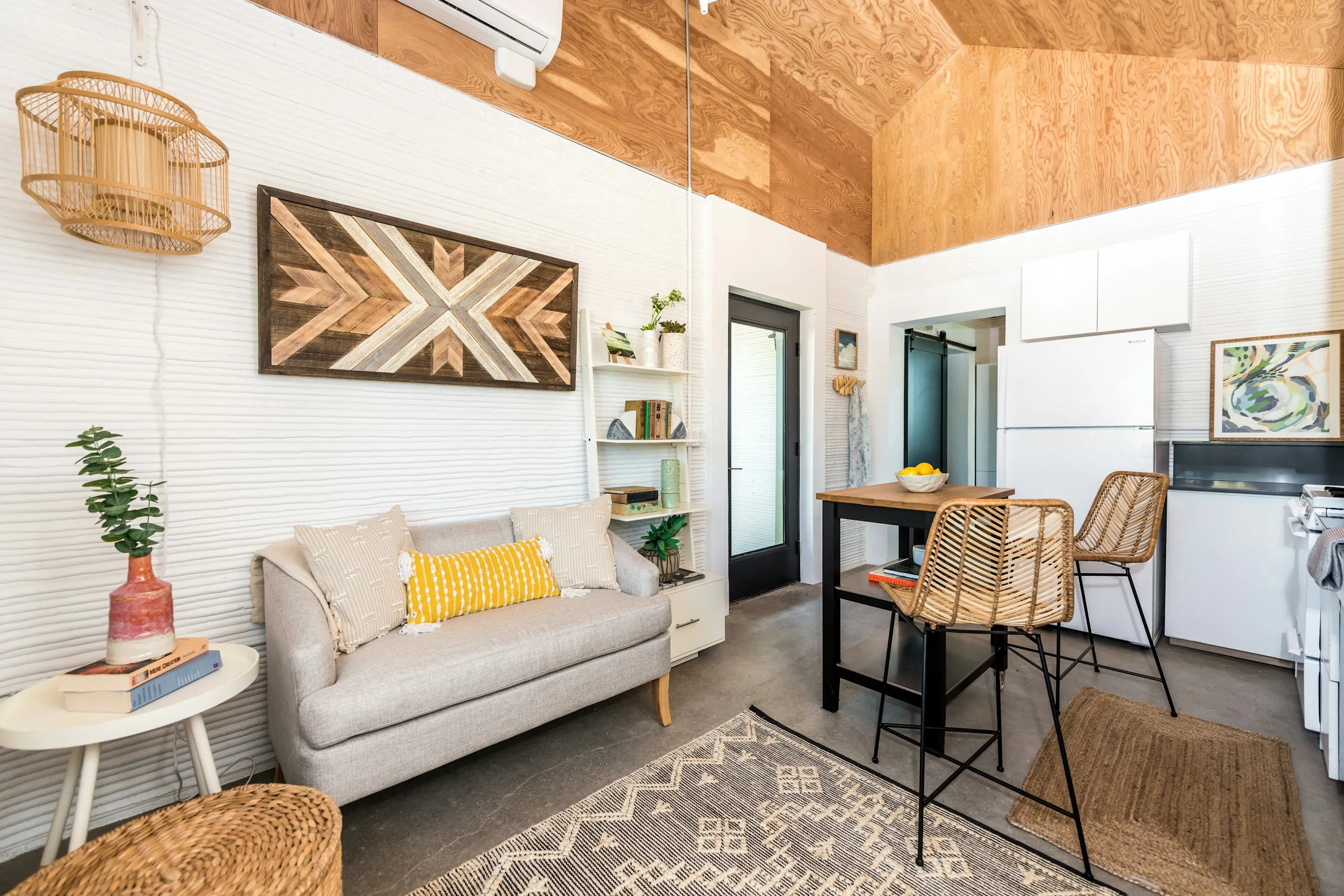 DEN Property Group sponsored the interior design completion of the homes allowing ICON and MLF to provide furnishings, decor and artwork to create a wonderful place for these individuals to call home. Designer, Claire Zinnecker, continued to work alongside ICON to create beautiful interiors for this series of 3D-printed homes receiving input from the future residents.